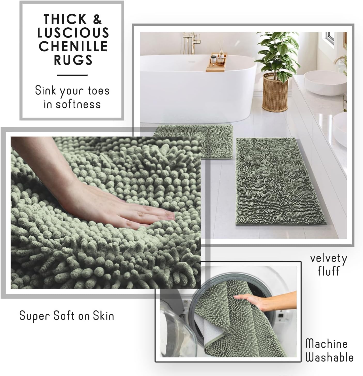 2 Bath Mats for Bathroom, Non Slip: Each chenille bath rug is super soft and highly absorbent, with non-skid backing. Black bathroom rug set: Small 17”x24”; Large 20”x32”