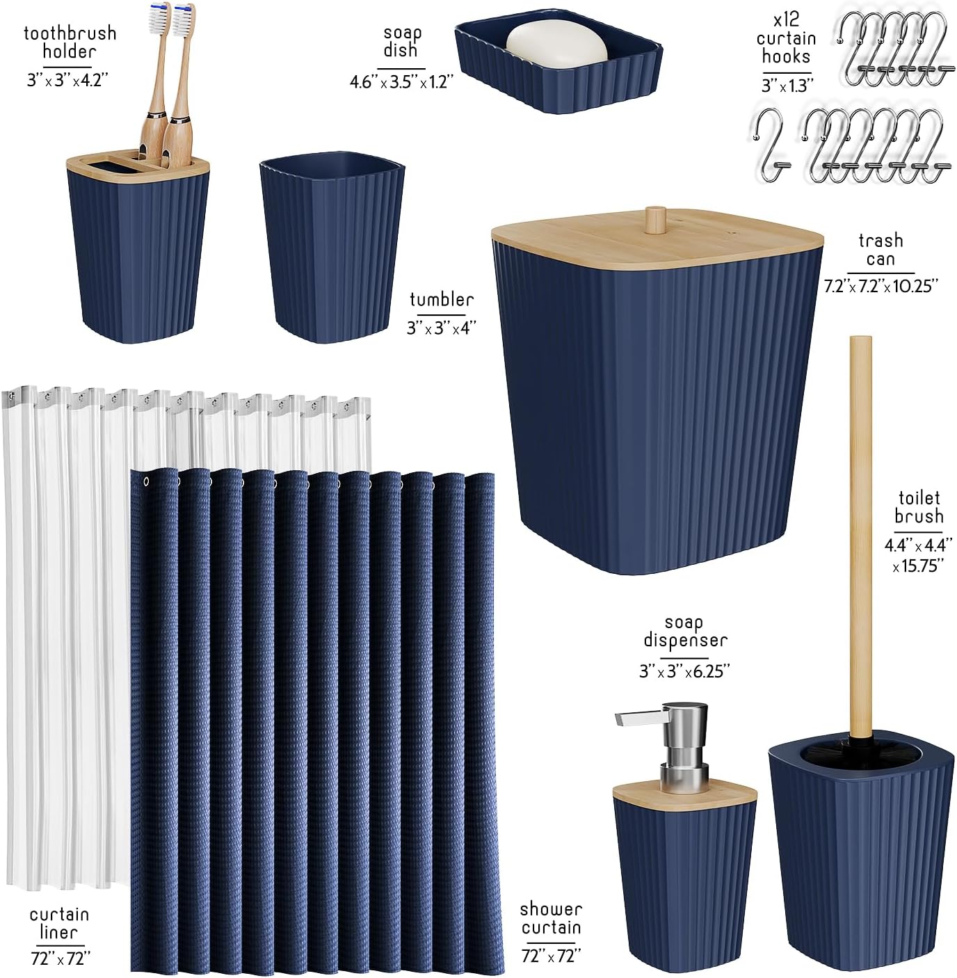 - Bathroom Sets with Shower Curtain and Rugs: Includes 2 bathroom rugs, toothbrush holder, tumbler, soap dispenser, soap dish, bathroom trash can, toilet brush and holder set, 12 shower curtain hooks, and fabric shower curtain set with clear shower curtain liner.