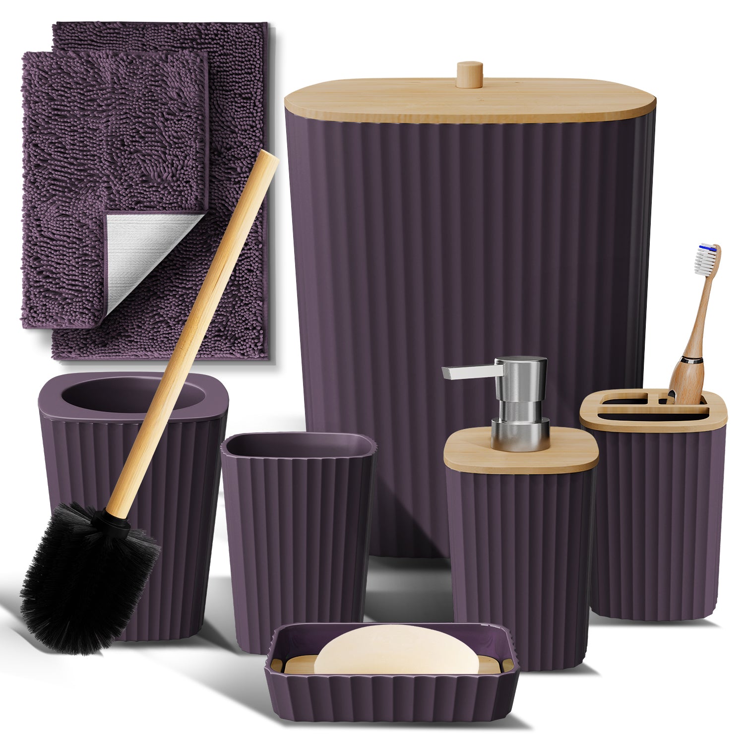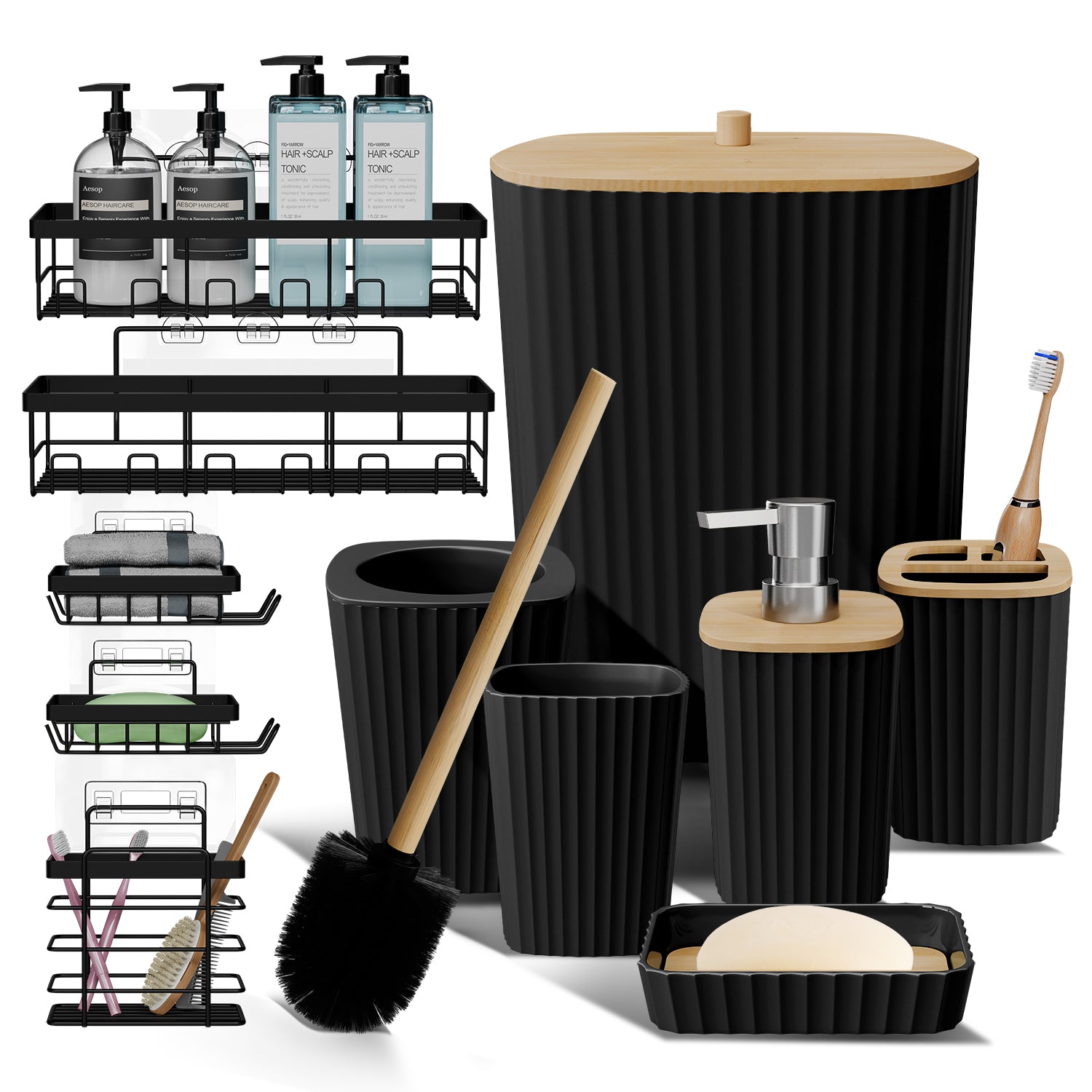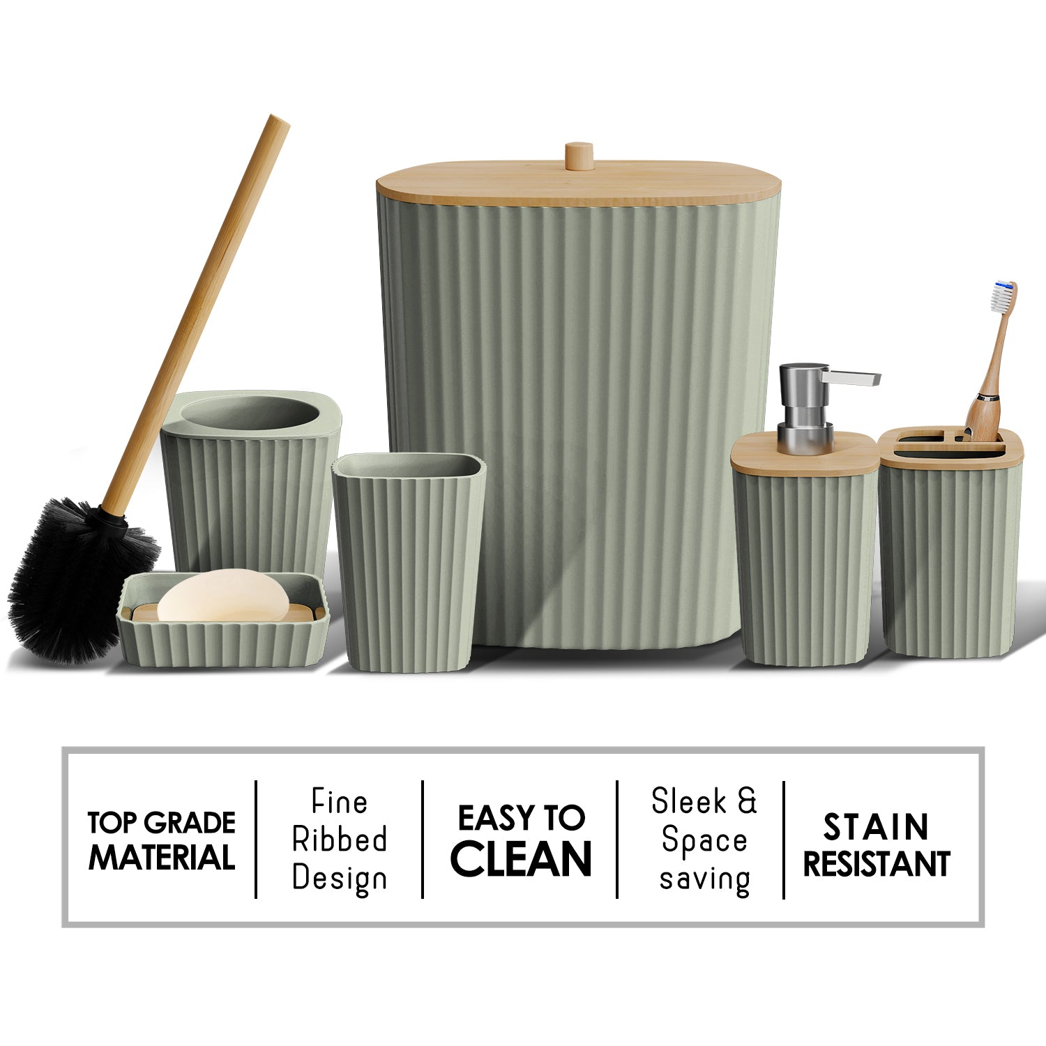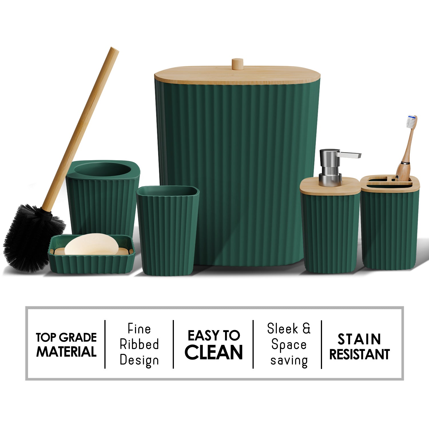 - Complete Bathroom Set: Includes toothbrush holder, tumbler, soap dispenser, soap dish, bathroom trash can, toilet brush and holder set.