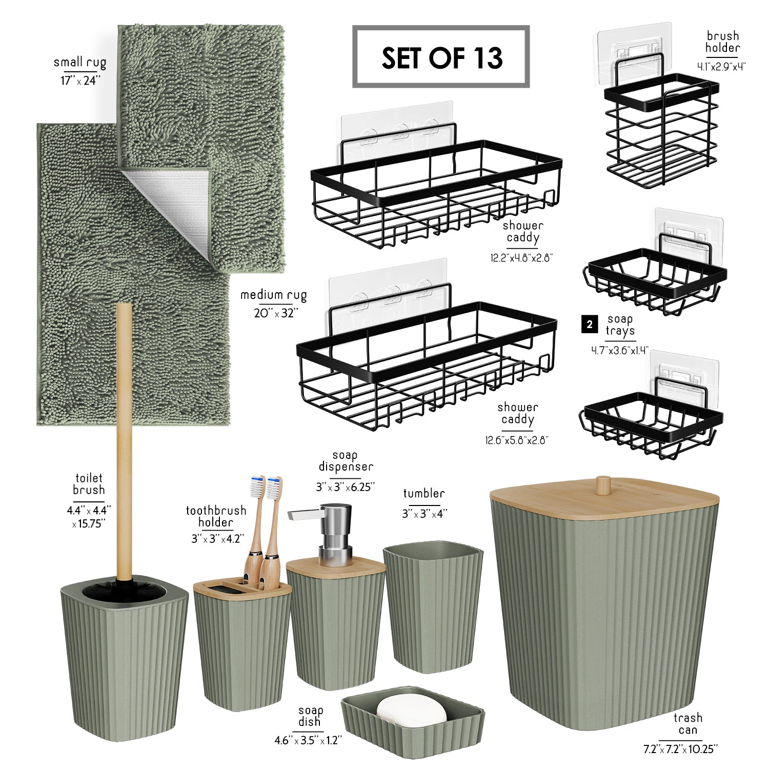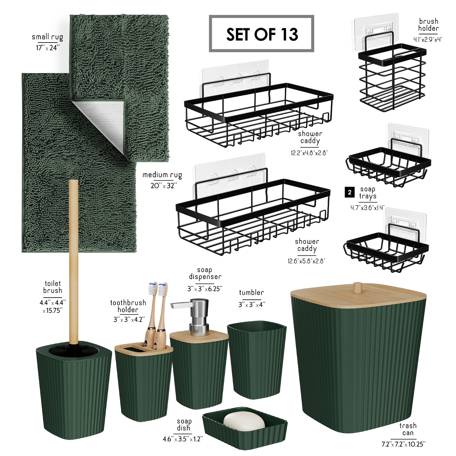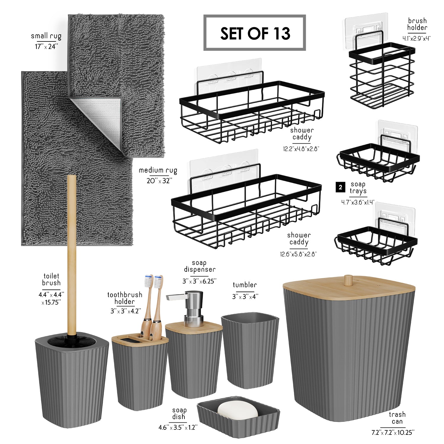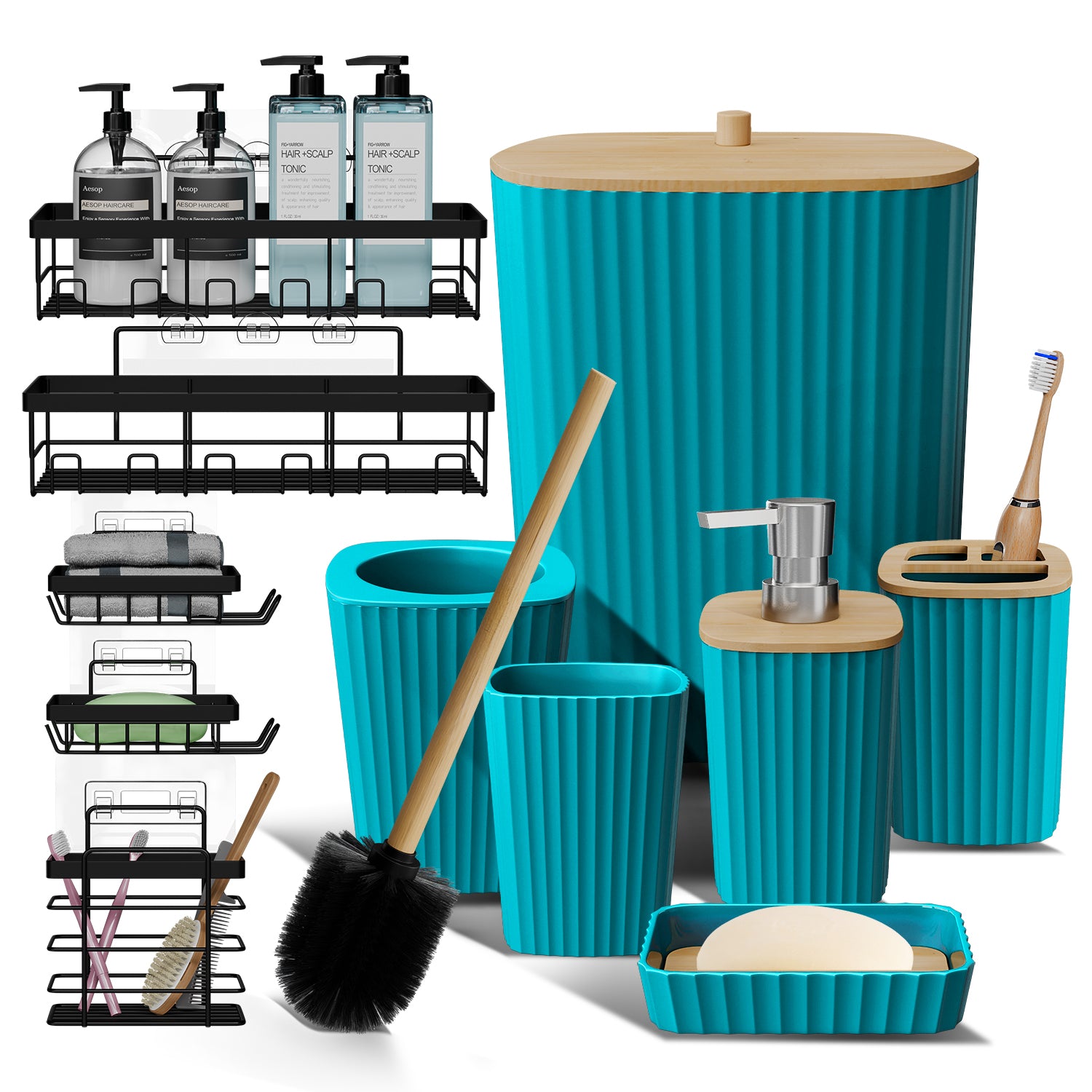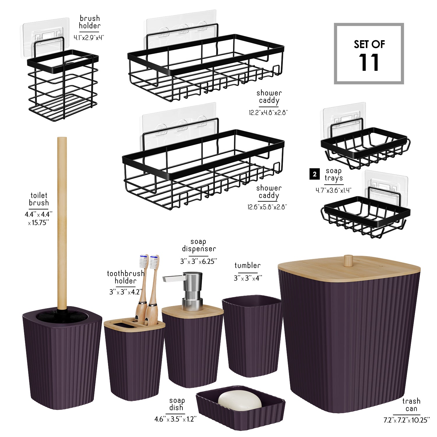 - Complete Bathroom Set: Includes toothbrush holder, tumbler, soap dispenser, soap dish, bathroom trash can, toilet brush and holder set.