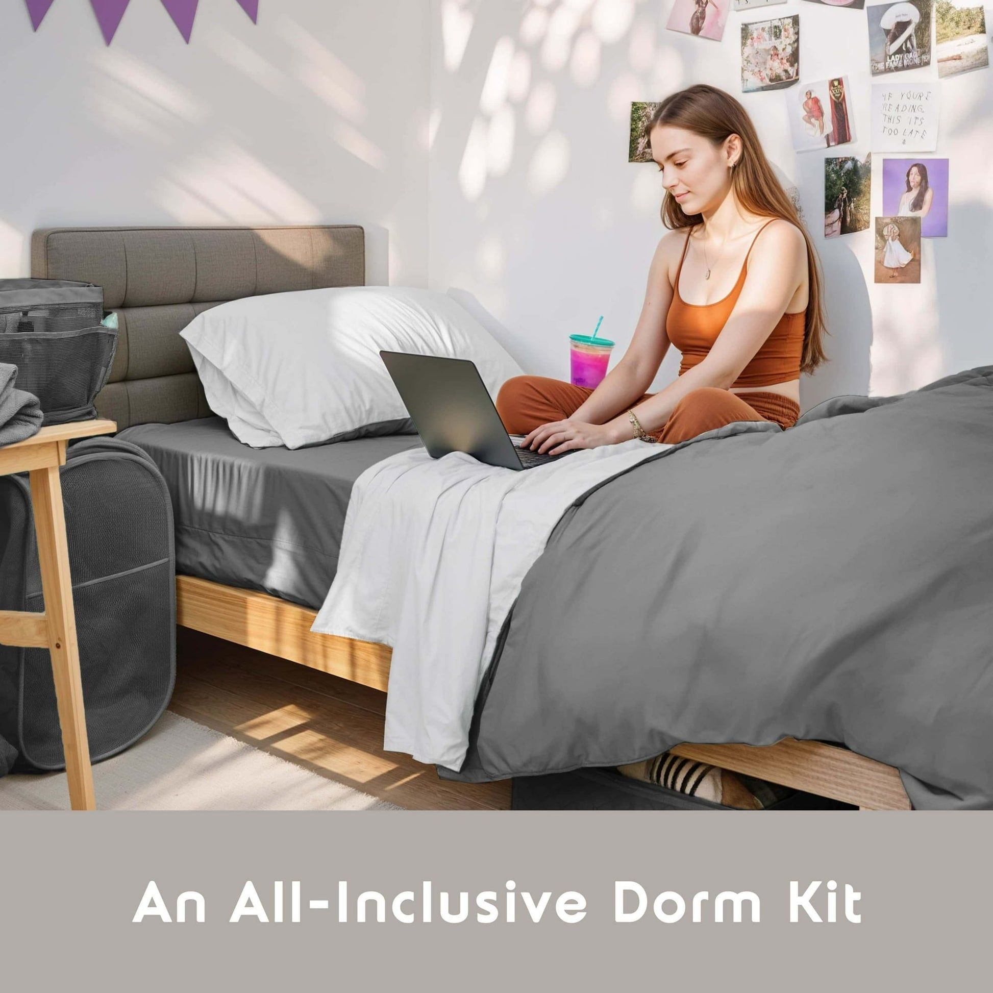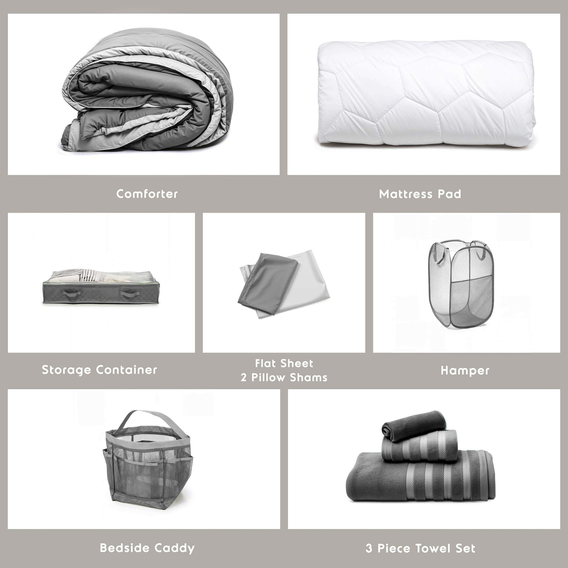 The Virtu Back to College Dorm Essentials Kit is the perfect solution for all college students and dorm residents. Our bed in a bag offers the most comfortable sleep with the most seamless design, making it a perfect fit for any style dorm room. Bring the feeling of your bed at home with you to your dorm with our most comfortable twin xl comforter, you will get the most needed good nights rest with this bedding in a bag comforter and bedding set. This dorm kit includes every dorm necessity you need to complete your college packing checklist! The softest bath towels ensure easy care with no extra headache with the busy school schedule. We include underbed storage to help with the need of more storage space while keeping the mess and clutter out of sight. Buying a basic dorm package saves you time and adds convenience to your dorm shopping experience. Plus, it is more affordable to choose our bulk Dorm Set, so you can get everything you need for college and save with this as an economical solution. Simplifying your dorm shopping process renders your transition from high school to college smoother and stress-free. Streamline your dorm shopping experience by availing of this comprehensive dorm bedding package