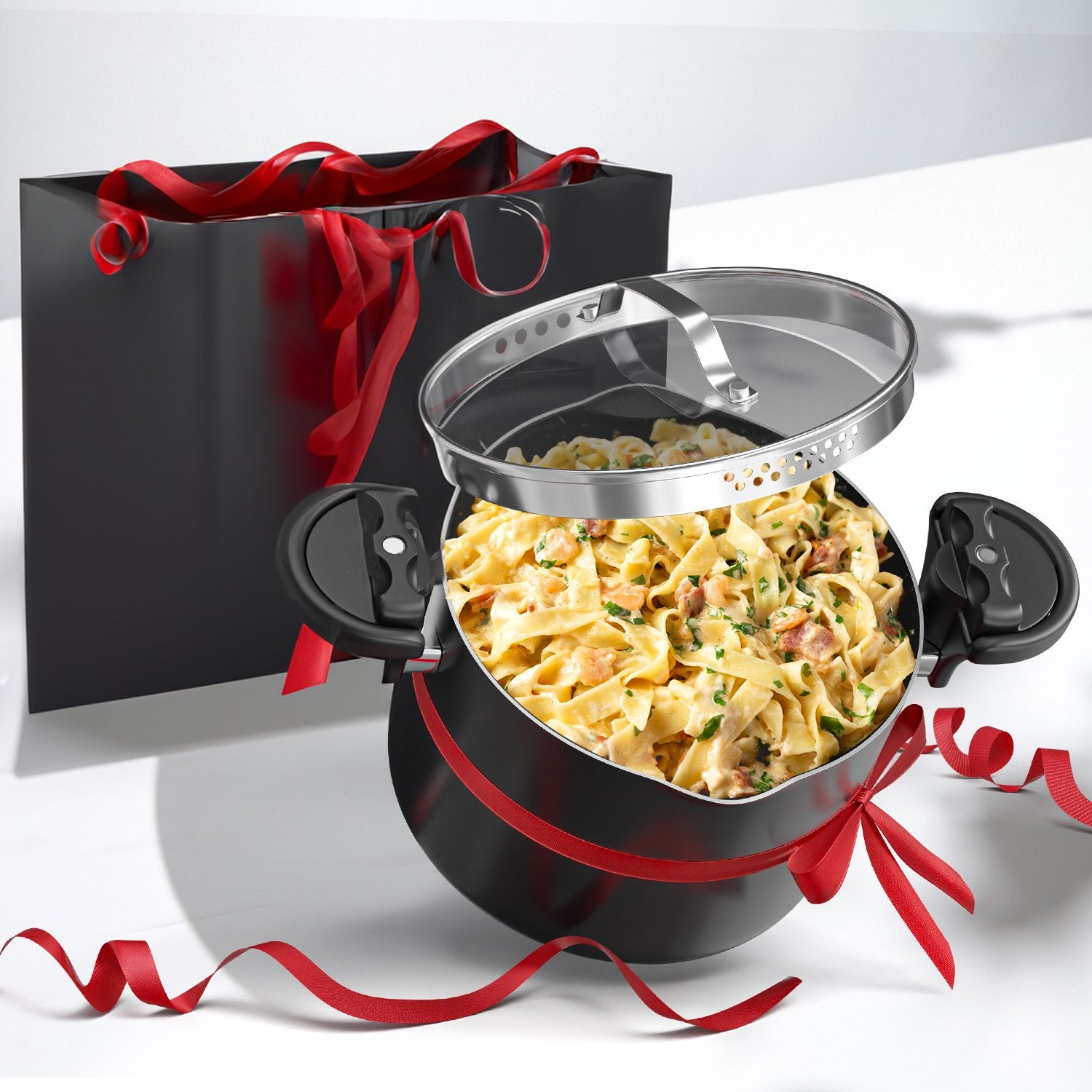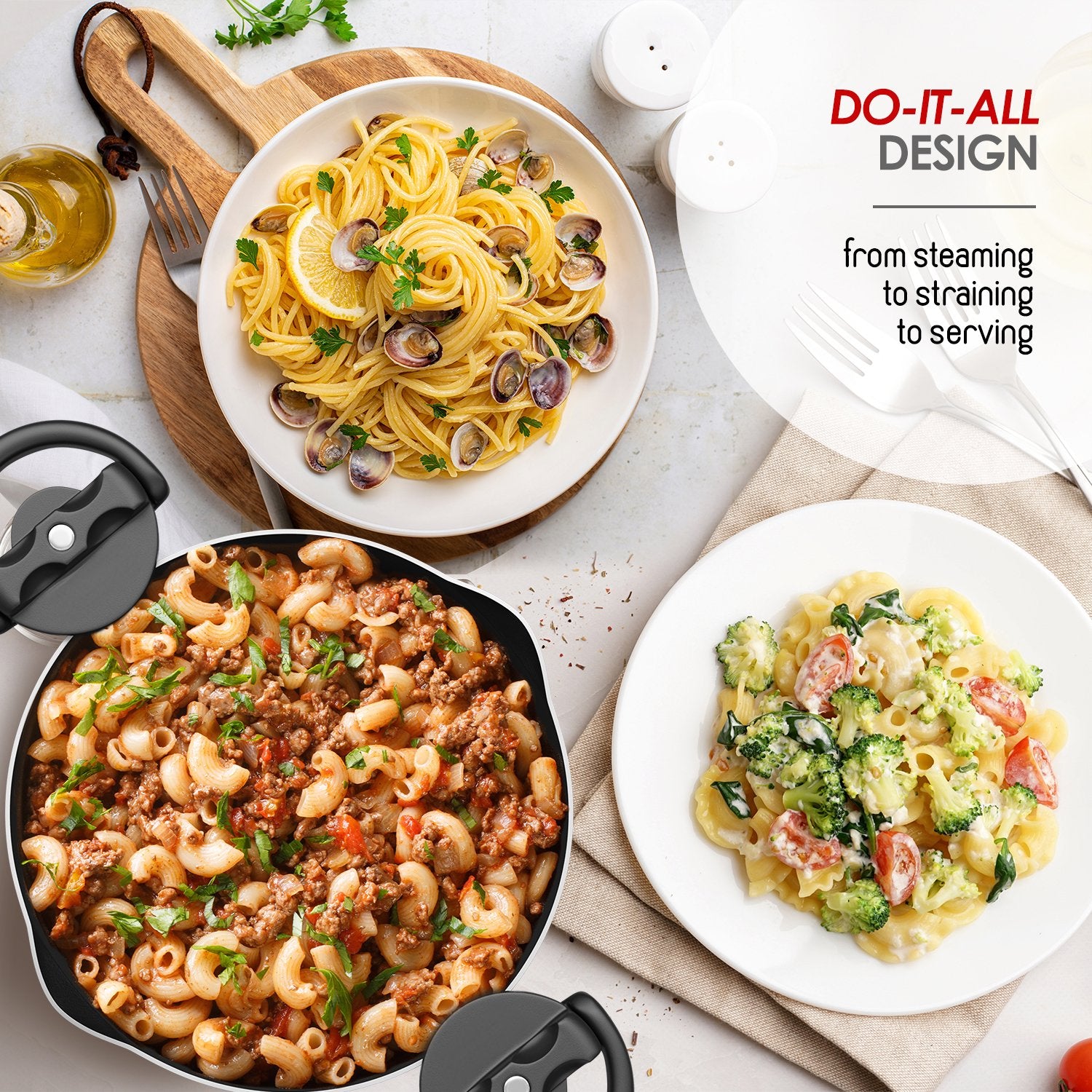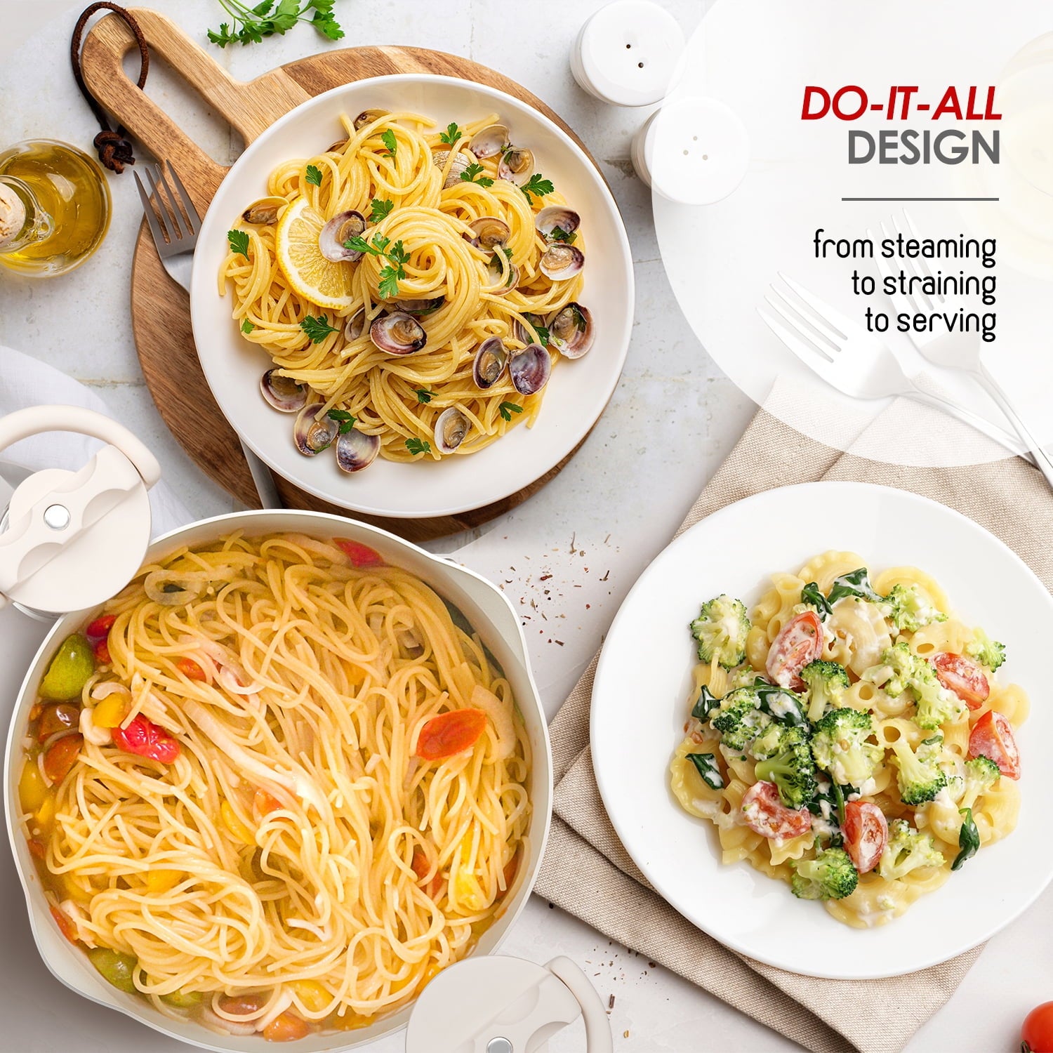 Transform your cooking routine with our versatile pasta pot, engineered for a wide range of culinary tasks. This pot adapts to your every need, from steaming vegetables to whipping up hearty stews. Its ergonomic design includes comfort-grip handles for a secure hold, while the twist-lock lid keeps everything contained. With dimensions of 9.7"D x 5.2"H, it's perfectly sized for family meals and gatherings, ensuring you have the right tool for every cooking experience. Experience hassle-free cooking and serving with our innovative pot featuring a built-in strainer lid. This unique design allows for precise straining, eliminating the need for separate colanders. Its premium aluminum body ensures even heating, while the ultra non-stick ceramic coating makes food glide out effortlessly. Plus, with dishwasher-safe materials, cleanup is a breeze. Whether you're boiling pasta or preparing popcorn, this pot offers dependable performance and convenience.