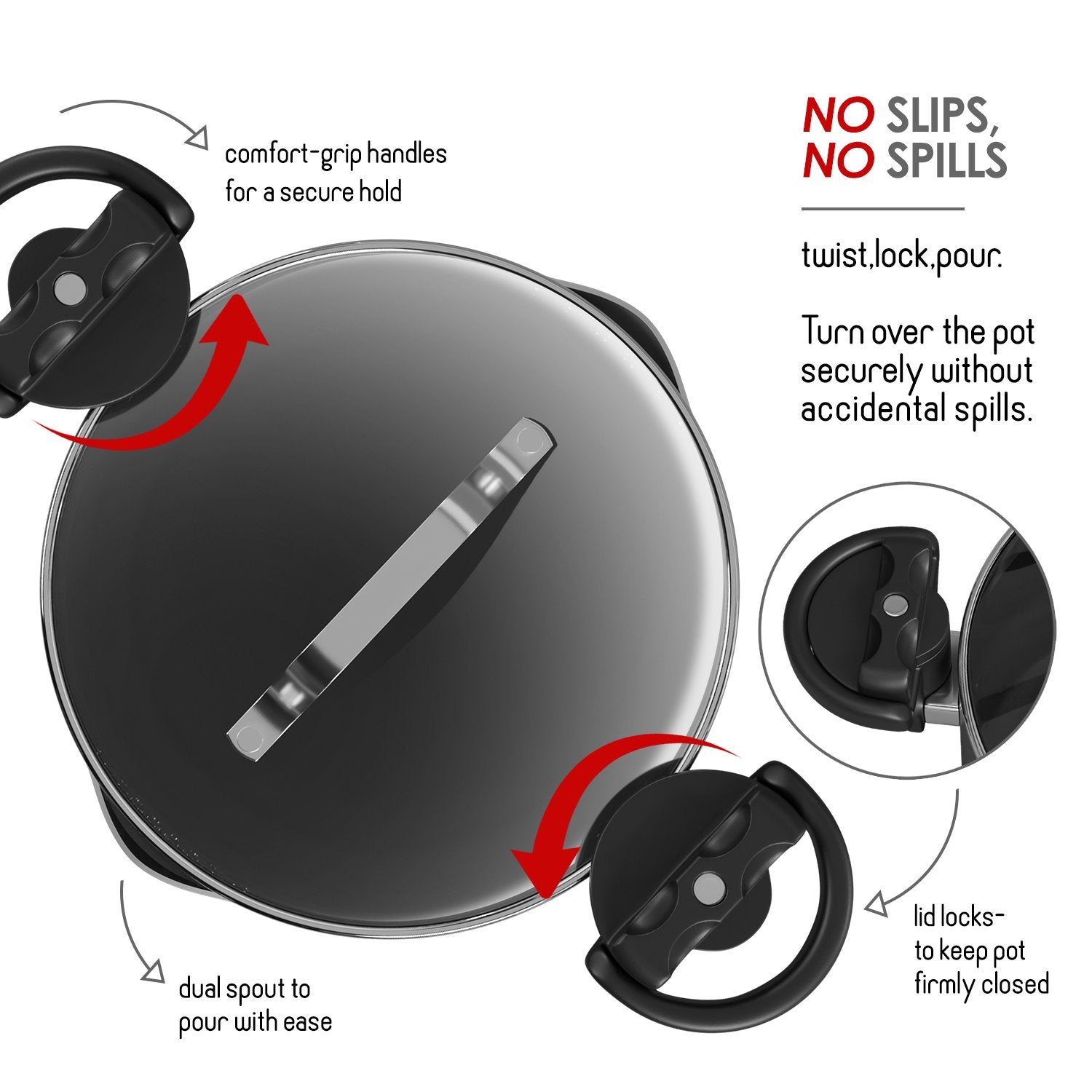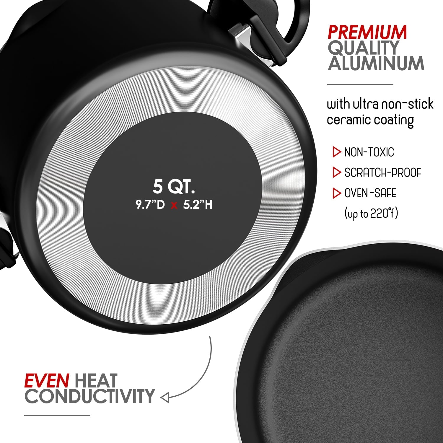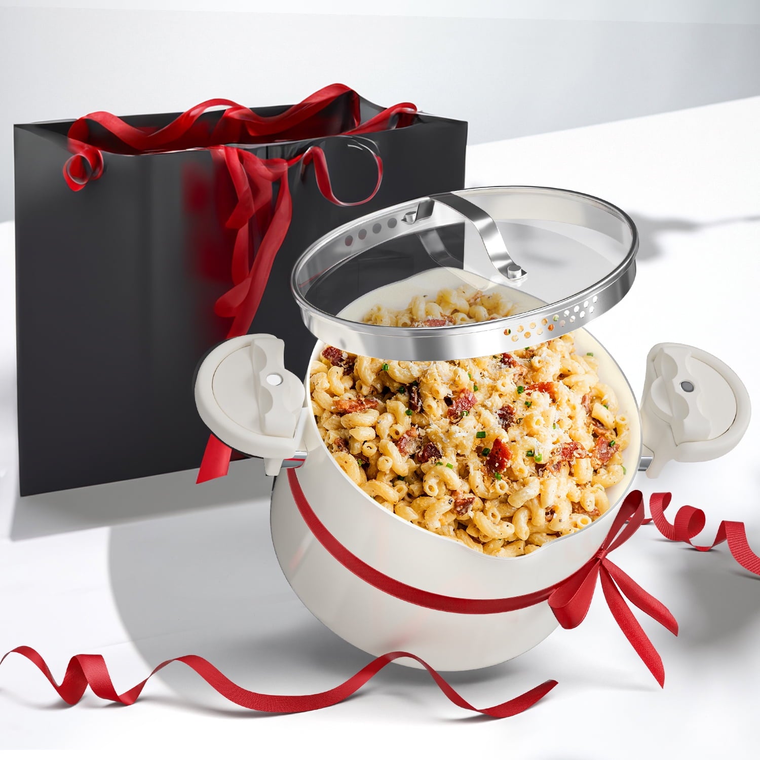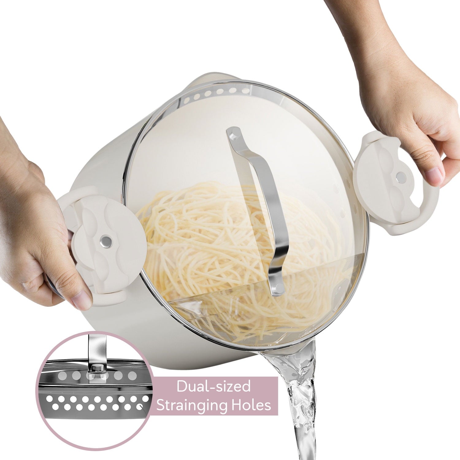 Transform your cooking routine with our versatile pasta pot, engineered for a wide range of culinary tasks. This pot adapts to your every need, from steaming vegetables to whipping up hearty stews. Its ergonomic design includes comfort-grip handles for a secure hold, while the twist-lock lid keeps everything contained. With dimensions of 9.7"D x 5.2"H, it's perfectly sized for family meals and gatherings, ensuring you have the right tool for every cooking experience. Experience hassle-free cooking and serving with our innovative pot featuring a built-in strainer lid. This unique design allows for precise straining, eliminating the need for separate colanders. Its premium aluminum body ensures even heating, while the ultra non-stick ceramic coating makes food glide out effortlessly. Plus, with dishwasher-safe materials, cleanup is a breeze. Whether you're boiling pasta or preparing popcorn, this pot offers dependable performance and convenience.