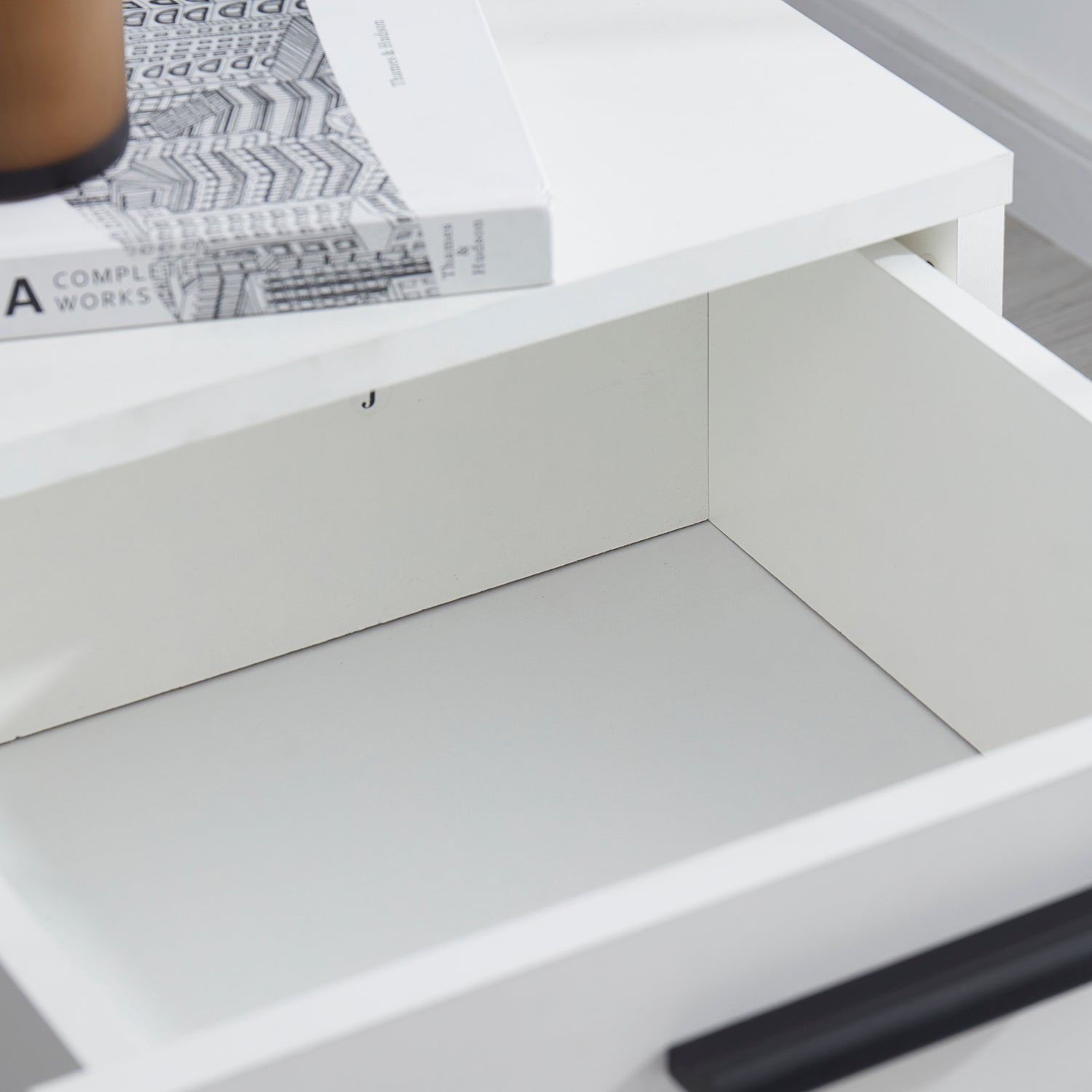 Enhance your bedroom or living room decor with Virtu's 2 Drawer Storage Table, featuring two spacious drawers for storing essential items. Crafted from sturdy chipboard with a natural wood-grain design and strong steel legs, this versatile storage table will look great in every room in your home and can be used as a bedside table, end table, side table, or anywhere you need additional storage.